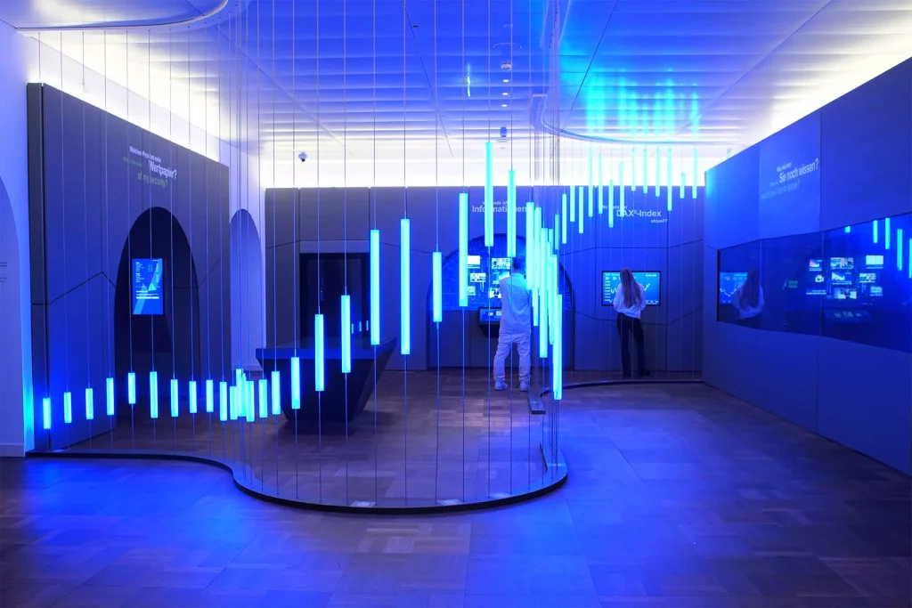 COSALUX gestaltet ein Besucherzentrum für die Deutsche Börse, das Kapitalmärkte interaktiv erklärt – im neuen Corporate Design, mit klarer Wissensführung und erlebnisorientierten Medien.
