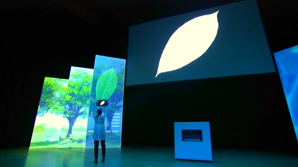 Ein großflächiges Project Mapping taucht Models und Artists in virtuelle Landschaften ein, die scheinbar endlos wirken.